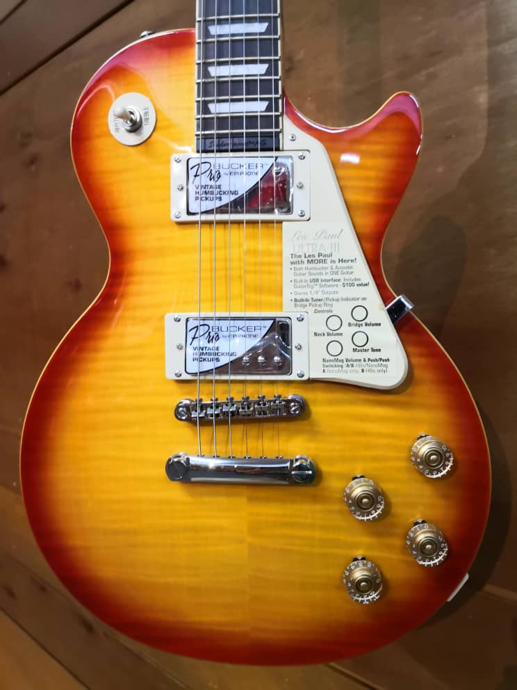 The Epiphone Les Paul Ultra-III is the Les Paul of the future powered by both traditional Pro-Bucker™ humbuckers plus the Shadow™ NanoMag™ pickup system that captures the Les Paul’s subtle body acoustics and string harmonics. With stereo, mono, and USB outputs, plus a chromatic tuner and individual gain and tone controls for each pickup system. Includes USB cable and online Native Instruments GuitarRig™ 4LE for amp simulations and more!